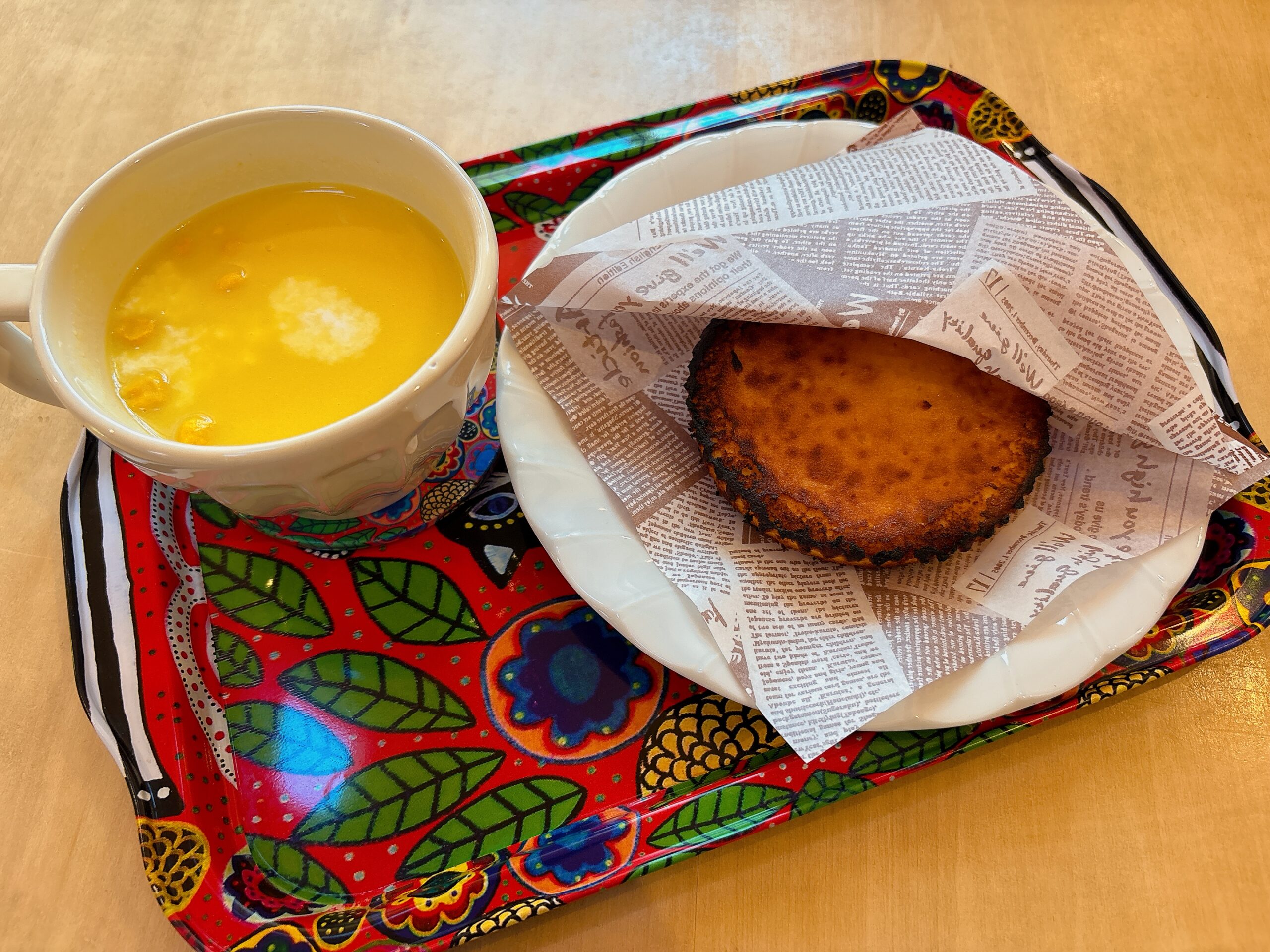 「ワンハンドさんかくぱん」または「窯焼きマドレーヌ」から1つ、さらに「コーンポタージュ」または「じゃがいもチーズポタージュ」から1つ選べるうれしいセットです。この日は窯焼きマドレーヌとコーンポタージュをチョイス♪マドレーヌは注文後にもう一度窯で焼き上げてくれるので、店内にあま〜い香りがふわっと広がります。焼きたてならではのやさしい甘さが◎